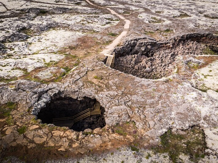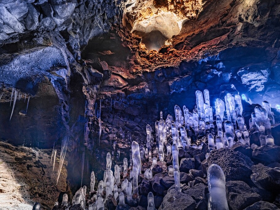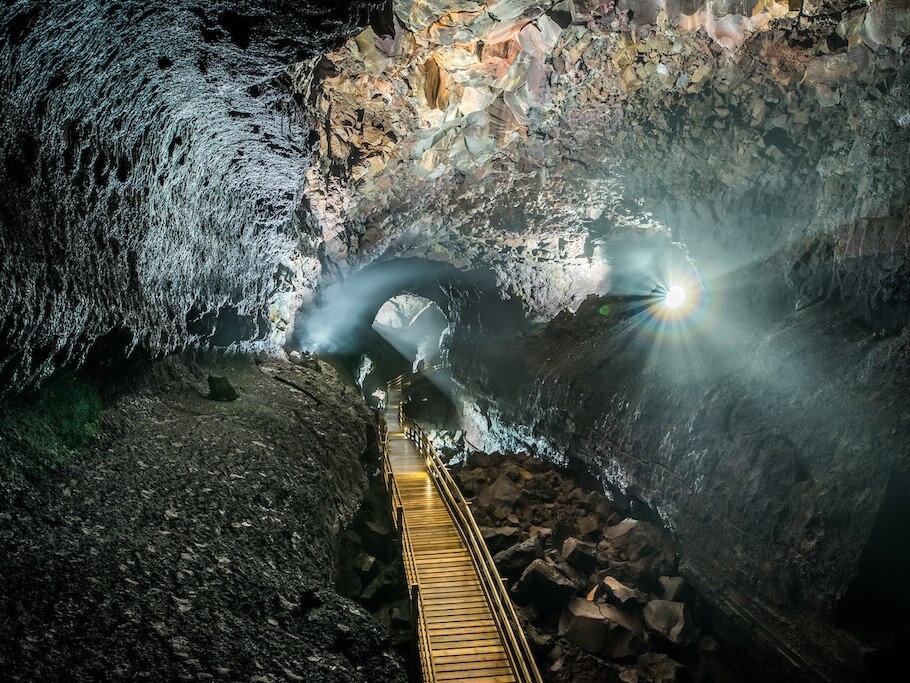 Hallmundarhraun is een immens uitgestrekt lavaveld in de omgeving van Húsafell in westelijk IJsland. In dit uitgestrekt gebied bevindt zich Víðgelmir, een van de best bewaarde lavatunnels van IJsland en zelfs van de wereld! Locals bieden een begeleide tour aan over een houten wandelpad waarbij je je door lavatunnels van de ene grot naar de andere begeeft. Het gemakkelijk toegankelijke pad is verlicht en onthult een magische onderwereld van bijzondere rotsformaties en speciale kleuren. Aanrader voor al wie interesse heeft in geologie. De tour duurt anderhalf uur en er zijn meerdere vertrekken per dag.